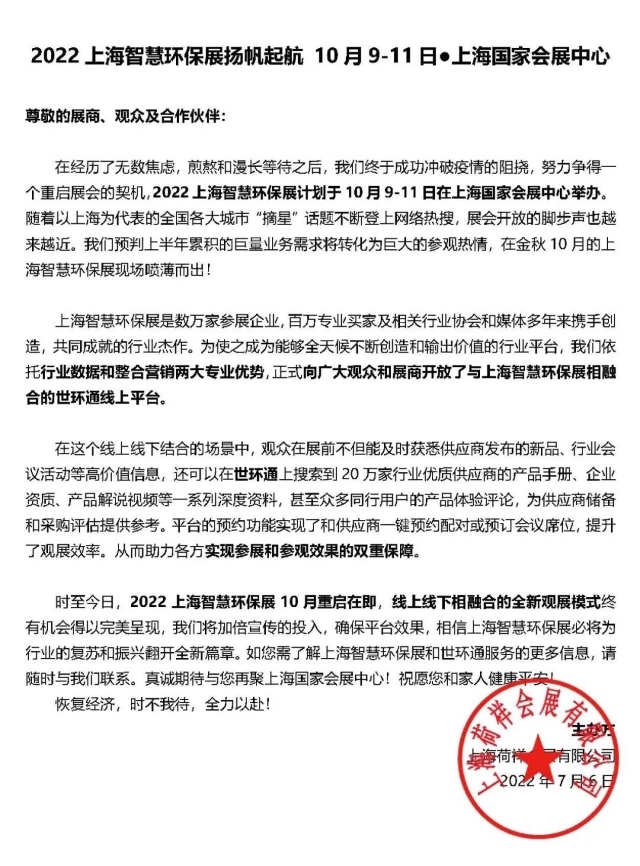時(shí)至今日,2022上海智慧環(huán)保展10月重啟在即,線(xiàn)上線(xiàn)下相融合的全新觀展模式終有機(jī)會(huì)得以呈現(xiàn),我們將加倍宣傳的投入,確保平臺(tái)效果,相信上海智慧環(huán)保展必將為行業(yè)的復(fù)蘇和振興翻開(kāi)全新篇章。如您需了解上海智慧環(huán)保展和世環(huán)通服務(wù)的更多信息,請(qǐng)隨時(shí)與我們聯(lián)系。真誠(chéng)期待與您再聚上海國(guó)家會(huì)展中心!祝愿您和家人健康平安!