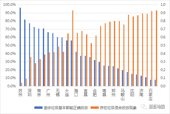 2021年12月,IPE和萬科公益基金會(huì)聯(lián)合發(fā)布了《垃圾分類指數(shù)(GSI)暨2021年城市評(píng)價(jià)報(bào)告》,使用自2020年11月-2021年10月隨手拍數(shù)據(jù),得出了22個(gè)重點(diǎn)城市主城區(qū)社區(qū)垃圾分類指數(shù)及排名。評(píng)價(jià)結(jié)果顯示,蘇州市構(gòu)建了行之有效的管理模式,以總分86.2分遙遙領(lǐng)先,南京市也以52.6分排名第三;排名第二、四的是深圳市(53.5分)和北京市(37.9分)。天津、西安、鄭州排名靠后。(評(píng)價(jià)方法和結(jié)果詳見《垃圾分類指數(shù)(GSI)暨2021年城市評(píng)價(jià)報(bào)告》)