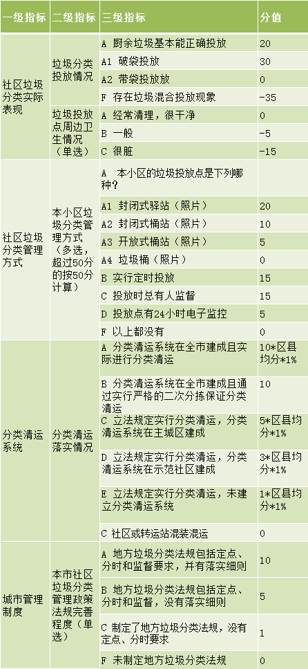 為便于對(duì)不同社區(qū)、不同區(qū)縣和不同城市的社區(qū)垃圾分類現(xiàn)狀進(jìn)行橫向及縱向比較,IPE基于蔚藍(lán)地圖APP垃圾分類隨手拍問卷設(shè)計(jì)了垃圾分類指數(shù)(Garbage Sorting Index, 以下簡稱GSI),從社區(qū)垃圾分類實(shí)際表現(xiàn)、社區(qū)垃圾分類管理措施、垃圾分類清運(yùn)情況和城市生活垃圾管理制度四個(gè)維度,對(duì)地級(jí)及以上城市、區(qū)(市)、居住社區(qū)的生活垃圾分類實(shí)際情況進(jìn)行量化評(píng)價(jià),滿分100分,附加分20分,得分通過垃圾分類隨手拍和調(diào)研發(fā)現(xiàn)實(shí)時(shí)動(dòng)態(tài)更新。