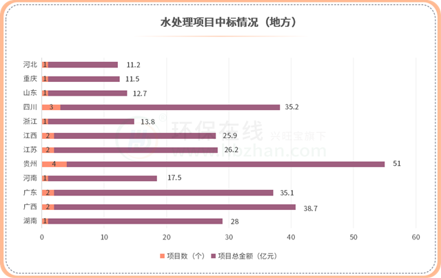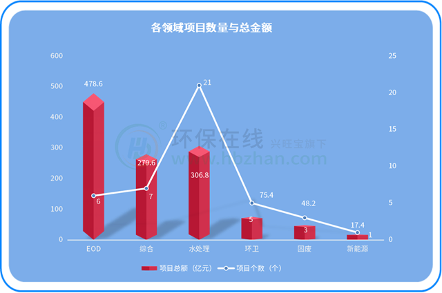圖中也可以看出,水處理項(xiàng)目仍然是最多的類別,不過EOD項(xiàng)目以及生態(tài)環(huán)境綜合項(xiàng)目雖然數(shù)量少,但項(xiàng)目金額相當(dāng)可觀。
