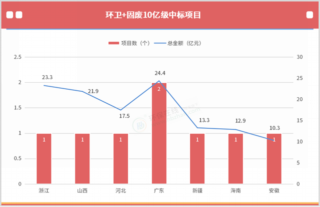 上半年,固廢和環(huán)衛(wèi)中標(biāo)的10億級(jí)項(xiàng)目也有18.6%,總金額占比也超過了10%,算得上豐收了。而且,上榜的固廢項(xiàng)目并不再以垃圾焚燒為主,固廢資源化的發(fā)展勢(shì)頭還是向好的。