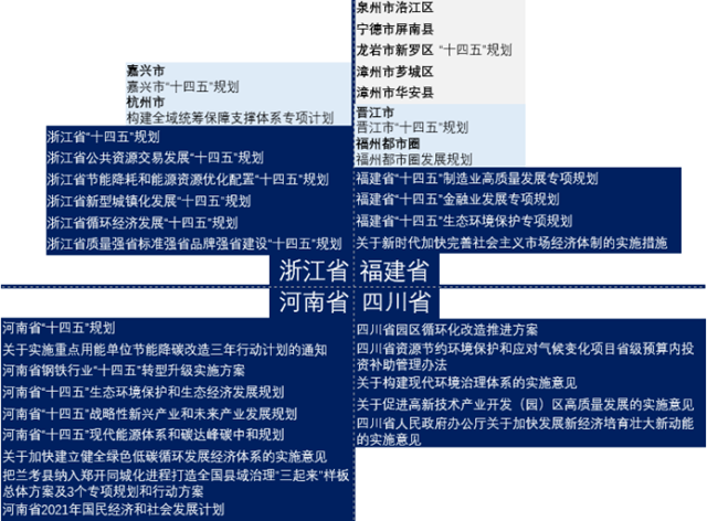 除試點(diǎn)四省外,全國(guó)其余省與自治區(qū)均積極響應(yīng)全國(guó)“十四五”規(guī)劃對(duì)用能權(quán)市場(chǎng)建設(shè)的要求。如下圖所示,我國(guó)大陸所有省份均在省級(jí)規(guī)劃中將用能權(quán)市場(chǎng)列入,在省級(jí)層面對(duì)用能權(quán)市場(chǎng)建設(shè)提供支持,多市在市級(jí)層面出臺(tái)政策與規(guī)劃,進(jìn)一步提高對(duì)用能權(quán)市場(chǎng)建設(shè)的支持力度。有關(guān)政策覆蓋生態(tài)環(huán)境保護(hù)、高碳行業(yè)低碳改造、產(chǎn)業(yè)轉(zhuǎn)型升級(jí)、金融、環(huán)境權(quán)益交易市場(chǎng)協(xié)調(diào)建設(shè)等多個(gè)領(lǐng)域,為我國(guó)建設(shè)全國(guó)用能權(quán)交易市場(chǎng)以通過(guò)市場(chǎng)化手段促進(jìn)產(chǎn)業(yè)提效轉(zhuǎn)型、推動(dòng)綠色發(fā)展具有顯著促進(jìn)作用。