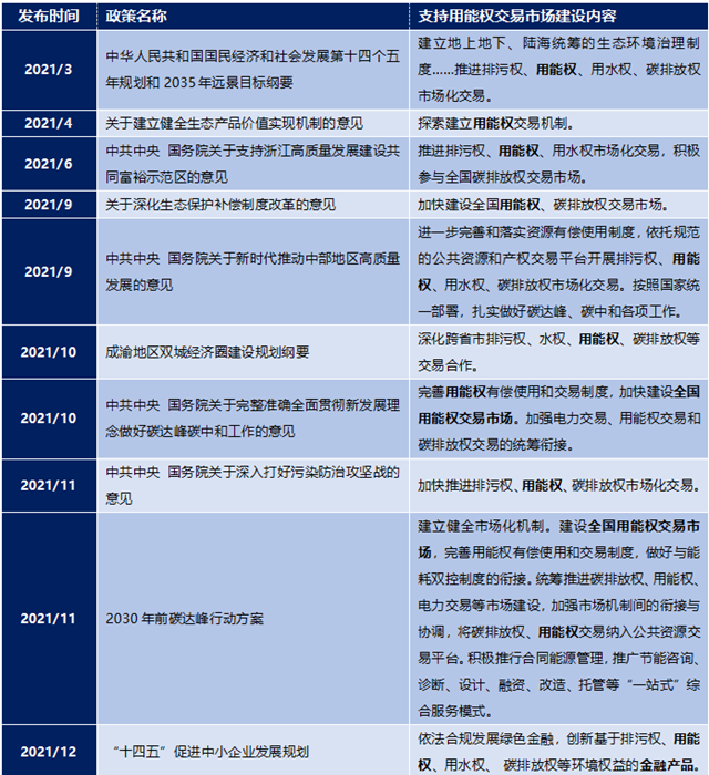 表 1 2021年國(guó)家層面支持用能權(quán)交易市場(chǎng)建設(shè)政策