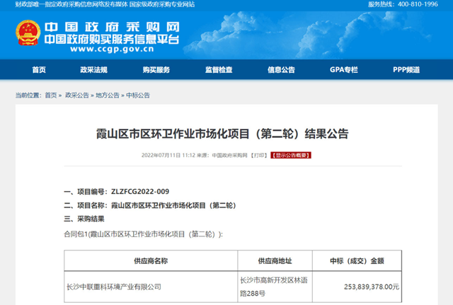經(jīng)歷了去年的短暫下滑之后,盈峰環(huán)境在2022年上半年迎來爆發(fā)。7月11日,中國政府采購網(wǎng)發(fā)布廣東省湛江市霞山區(qū)市區(qū)環(huán)衛(wèi)作業(yè)市場(chǎng)化項(xiàng)目(第二輪)結(jié)果公告,長沙中聯(lián)重科環(huán)境產(chǎn)業(yè)有限公司中標(biāo),中標(biāo)金額2.53839378億元,項(xiàng)目服務(wù)期為3年。