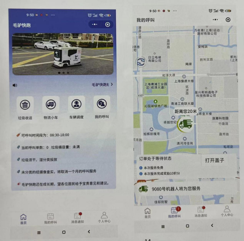 “小毛驢”的全稱是“毛驢快跑”垃圾分類收運(yùn)機(jī)器人。顧名思義它的主要功能是垃圾的分類收運(yùn),加上“快跑”技能,便成為了小區(qū)內(nèi)垃圾分類定時(shí)定點(diǎn)(約定時(shí)間、約定地點(diǎn))投放的一個(gè)移動(dòng)投放點(diǎn)。通過手機(jī)預(yù)約下單,約定時(shí)間和地點(diǎn),即可“召喚”小毛驢,投放垃圾。