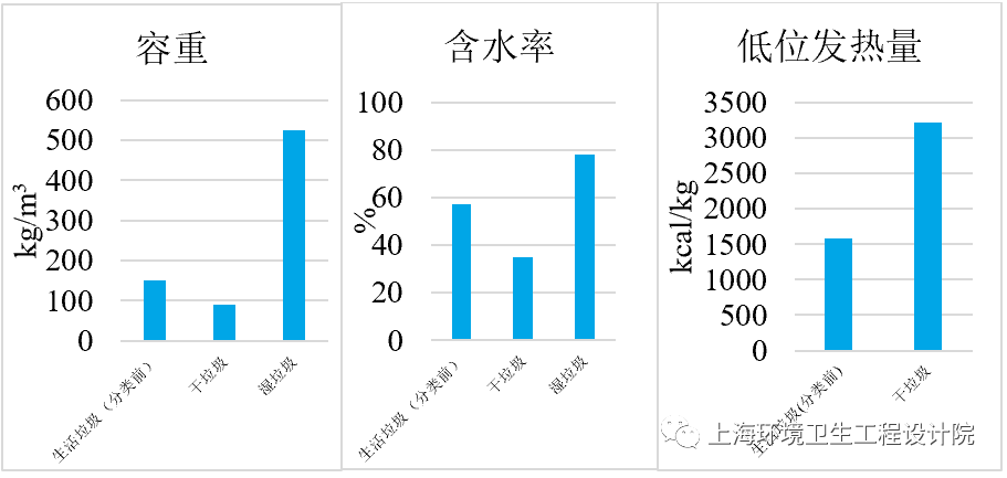 生活垃圾物理組成的變化導(dǎo)致其密度、含水率發(fā)生顯著變化?!稐l例》實施前,生活垃圾容重、含水率分別為151 kg/m3、56.96%,低位發(fā)熱量約1580 kcal/kg?!稐l例》實施后,相比于混合投放,干垃圾容重、含水率均下降約40%,且其低位發(fā)熱量則增到3210 kcal/kg;濕垃圾主要為廚余類,相比于混合投放,容重增加約247%,含水率增加約37%。干、濕垃圾容重之比約為1∶6,含水率之比約為9∶20。