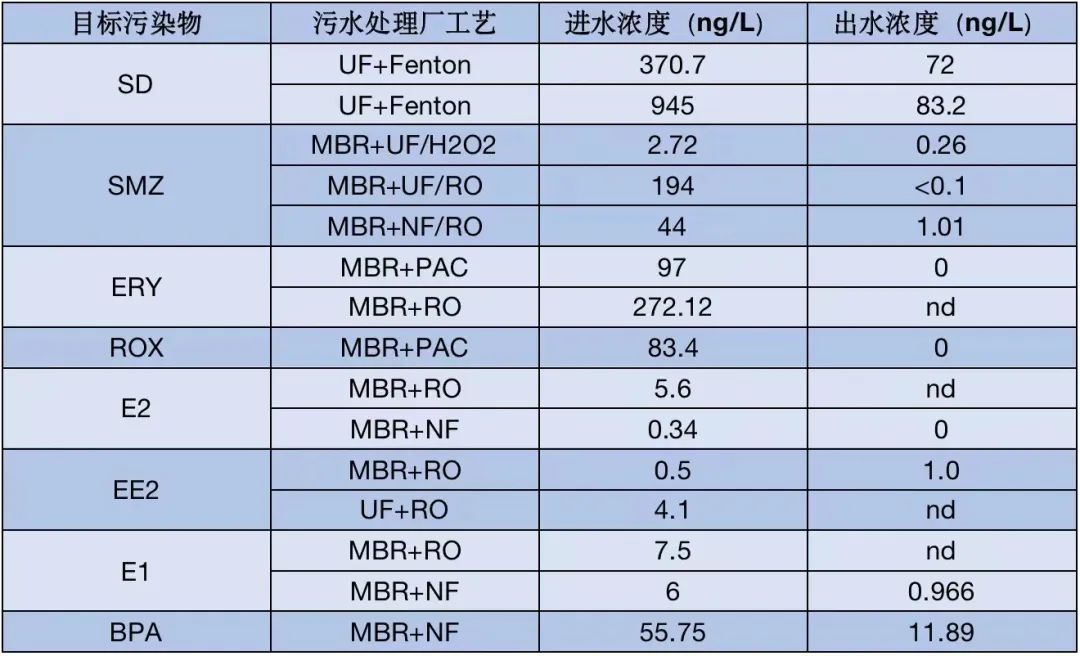 這3種投加方式均可實(shí)現(xiàn)對(duì)新污染物的穩(wěn)定去除,但對(duì)比來(lái)看:選擇適宜的PAC,優(yōu)化其投加量可提高吸附去除效率。有研究表明,隨著溶解性有機(jī)碳的增加,PAC對(duì)新污染物的吸附效率逐漸降低,當(dāng)二級(jí)出水中有機(jī)碳在5~10mg/L范圍內(nèi)時(shí),需要投加10~20mg/LPAC,可達(dá)到對(duì)新污染物的有效去除(>80%),同時(shí)能達(dá)到對(duì)有機(jī)碳最高40%的去除率,水力停留時(shí)間為20~30min,PAC的停留時(shí)間為1~2d。采用PAC吸附作為升級(jí)改造工藝去除新污染物,電能消耗將提高10%~30%,總成本將提高5%~35%。在實(shí)際運(yùn)行中,PAC吸附工藝會(huì)產(chǎn)生大量的含炭污泥,使污泥處理能耗相應(yīng)增加。據(jù)研究數(shù)據(jù)表明,PAC投加量為10~20 mg/L時(shí),PAC吸附工藝的電能消耗約為0.02 kWh/m3,后加砂濾單元產(chǎn)生的電能消耗約為0.06 kWh/m3。采用PAC回流到生物池的工藝比不采用回流的工藝對(duì)新污染物的去除率可提高10%~50%,但同時(shí)也會(huì)增加5%~10%的污泥。GAC過(guò)濾器一般置于常規(guī)污水處理廠工藝中的二沉池之后,既可吸附又可過(guò)濾,它可以連續(xù)運(yùn)行,無(wú)需后續(xù)的分離步驟。但GAC成本較高,再生困難,因此在實(shí)際應(yīng)用中不如PAC廣泛。活性炭吸附過(guò)程受許多因素的影響,包括活性炭本身特性(如所用材料、比表面積和表面化學(xué)特性等)、新污染物的物化特性(主要是疏水性、溶解性、電荷和分子大小等)、溶液的化學(xué)特性和組分(如可溶解性有機(jī)物DOM等)和活性炭投加量、吸附質(zhì)的濃度等其他基本參數(shù)。在新污染物的去除技術(shù)中,膜分離技術(shù)同樣也受到了很多關(guān)注,其中以納濾(NF)和反滲透(RO)對(duì)新污染物的去除效果最好。NF和RO技術(shù)均采用高壓膜,由于它們的孔徑極小,可以截留較小分子量物質(zhì),一般應(yīng)用于無(wú)機(jī)離子和有機(jī)污染物的截留。RO膜可以有效截留(>90%)水中有機(jī)小分子物質(zhì);雖然NF膜由于孔徑稍大截留效果不如RO膜,但NF技術(shù)的能耗較低,在對(duì)新污染物的去除中,具有明顯的操作和成本優(yōu)勢(shì)。值得一提的是,低壓膜如微濾(MF)膜和超濾(UF)膜由于孔徑較大,不足以截留大部分 新污染物,但因?yàn)槲鬯幚韽S二級(jí)出水中仍含有相對(duì)較高濃度的有機(jī)物,會(huì)對(duì)NF/RO的截留效果造成不利影響,所以MF/UF經(jīng)常作為NF/RO的前處理工藝。有機(jī)物是導(dǎo)致膜污染的主要原因,長(zhǎng)期運(yùn)行時(shí)會(huì)造成NF/RO膜通量下降、截留效果降低,因此在處理二級(jí)出水時(shí),采用MF/UF作為前處理工藝,對(duì)于維持NF/RO的長(zhǎng)期穩(wěn)定運(yùn)行十分必要。膜對(duì)新污染物的截留率取決于新污染物的物化特性(分子大小和重量,電荷和疏水性)、膜特性(膜材料、孔徑等)及操作條件等。值得一提的是,不同材料的膜對(duì)同種新污染物的截留效果不同,同種膜對(duì)不同新污染物的截留效果也不同。目前將NF/RO技術(shù)作為實(shí)際污水處理廠的升級(jí)改造工藝的報(bào)道并不多,其主要限制因素是能耗較高、膜污染以及膜分離過(guò)程中產(chǎn)生大量需要處理的濃縮液等。膜生物反應(yīng)器(MBR)具有污泥濃度高、生物種類多、出水水質(zhì)穩(wěn)定、固液分離能力強(qiáng)等特點(diǎn)。MBR的膜表面能夠有效的截留有機(jī)污染物,使污染物與污水進(jìn)行分離,所以MBR對(duì)大多數(shù)的有機(jī)污染物的截留效果較好。但較長(zhǎng)的SRT也可能會(huì)導(dǎo)致MBR中懸浮基質(zhì)活性生物量減少,影響對(duì)抗生素的去除。而且MBR對(duì)有機(jī)污染物的去除效率還受到污泥濃度、溫度和pH值等因素的影響。通過(guò)研究MBR工藝在污水處理廠中對(duì)新興污染物的去除,有學(xué)者發(fā)現(xiàn)其對(duì)E1、E3和BPA的去除率達(dá)到了100%;還有學(xué)者利用MBR工藝處理污水中的抗生素和新興生物群落,研究表明其對(duì)TC和CTC的去除率分別為93.6%和83.9%。盡管深度處理能夠去除大部分的新污染物,但仍有一部分新污染物沒(méi)有被去除。為此,在實(shí)際污水處理工藝中通常把多種深度處理技術(shù)聯(lián)合使用,取長(zhǎng)補(bǔ)短,有效地提高有機(jī)污染物的去除效率。根據(jù)文獻(xiàn)資料,小編列舉了多種組合工藝對(duì)幾種典型新污染物的去除效果,由圖中可以看出組合工藝對(duì)于新污染物的去除效率較高。這是一種高效的水處理工藝,對(duì)污水處理廠出水水質(zhì)有了很大的提升,這類聯(lián)合工藝對(duì)有機(jī)污染物的去除具有顯著的效果以及使用價(jià)值。我國(guó)新污染物防范治理起步較晚、工作基礎(chǔ)薄弱1、我國(guó)對(duì)于部分新污染物污染底數(shù)不清雖然在2015年提出開(kāi)展全國(guó)性環(huán)境激素整體監(jiān)測(cè)行動(dòng),但由于缺乏環(huán)境內(nèi)分泌干擾物(EDCs)的篩選和評(píng)估框架,以及監(jiān)測(cè)范圍和技術(shù)限制等原因,導(dǎo)致目前仍然無(wú)法全面掌握我國(guó)近年來(lái)環(huán)境內(nèi)分泌干擾物(EDCs)的生產(chǎn)、使用和排放現(xiàn)狀。同時(shí),大多數(shù)新污染物還未納入環(huán)境監(jiān)測(cè)體系內(nèi),對(duì)于全氟辛烷磺酸(PFOS)等新污染物缺乏監(jiān)管,導(dǎo)致許