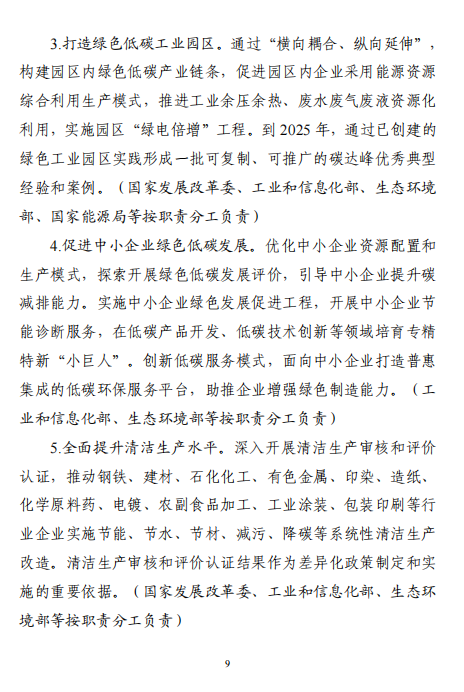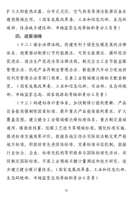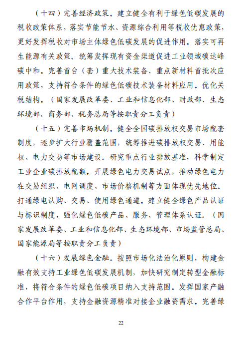 工業(yè)和信息化部 國家發(fā)展改革委 生態(tài)環(huán)境部關(guān)于印發(fā)工業(yè)領(lǐng)域碳達峰實施方案的通知工信部聯(lián)節(jié)〔2022〕88號外交部、科技部、司法部、財政部、住房城鄉(xiāng)建設(shè)部、交通運輸部、商務(wù)部、人民銀行、國資委、稅務(wù)總局、市場監(jiān)管總局、統(tǒng)計局、銀保監(jiān)會、證監(jiān)會、能源局、林草局、郵政局,各省、自治區(qū)、直轄市及計劃單列市、新疆生產(chǎn)建設(shè)兵團工業(yè)和信息化主管部門、發(fā)展改革委、生態(tài)環(huán)境廳(局):《工業(yè)領(lǐng)域碳達峰實施方案》已經(jīng)碳達峰碳中和工作領(lǐng)導(dǎo)小組審議通過,現(xiàn)印發(fā)給你們,請認真貫徹落實。