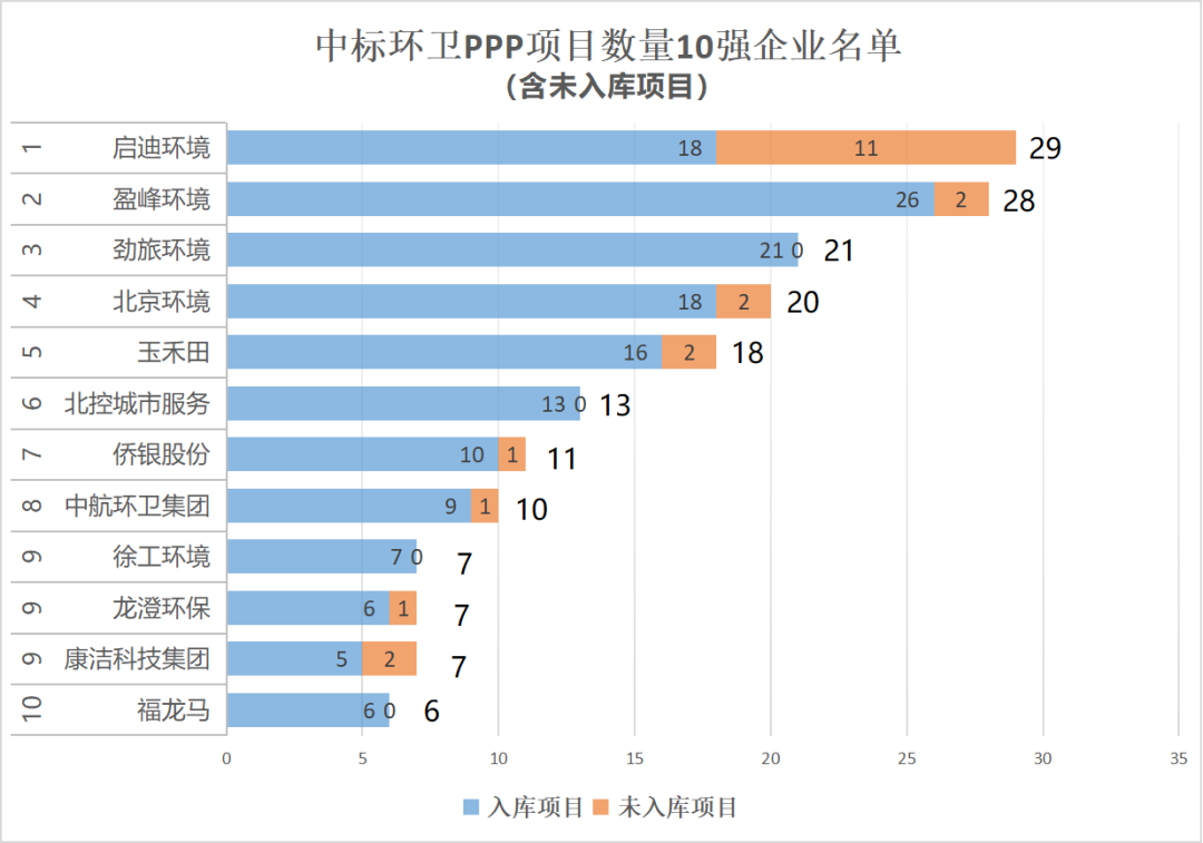 在337個已開標(biāo)環(huán)衛(wèi)PPP項目中,啟迪環(huán)境已中標(biāo)環(huán)衛(wèi)PPP項目數(shù)量多達29個,排名第一,占全部已已開標(biāo)環(huán)衛(wèi)PPP項目總量的8.6%。