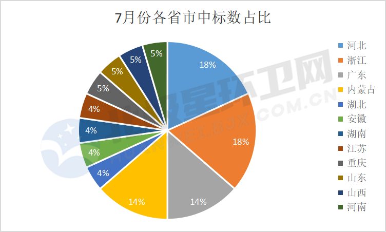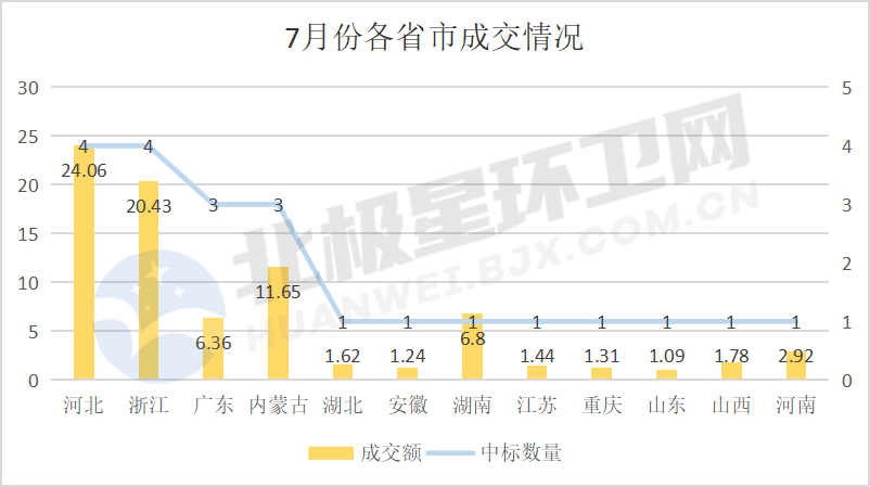 眾所周知,河北、浙江、廣東地區(qū)環(huán)衛(wèi)市場一直相當(dāng)火熱,7月也不例外,河北、浙江省均成交4個項目,成交額分別是24.06億元、20.43億元,榮獲冠、亞軍。