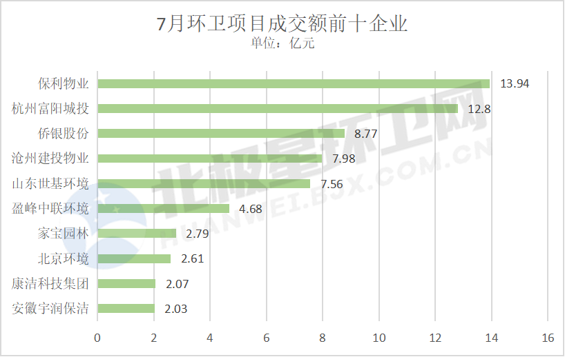 最終,保利物業(yè)、杭州富陽城投、僑銀股份、滄州建投物業(yè)、世基環(huán)境、盈峰環(huán)境、家寶園林、北京環(huán)境、康潔科技集團(tuán)、安徽宇潤保潔沖進(jìn)7月前十位排行榜。
