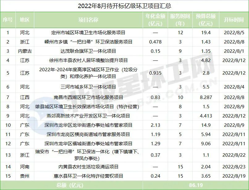 除此之外,北極星環(huán)衛(wèi)網(wǎng)還統(tǒng)計了8月待開標(biāo)的億級環(huán)衛(wèi)項目,預(yù)算總額約86.2億元,主要分布在華北地區(qū)和東南地區(qū)。