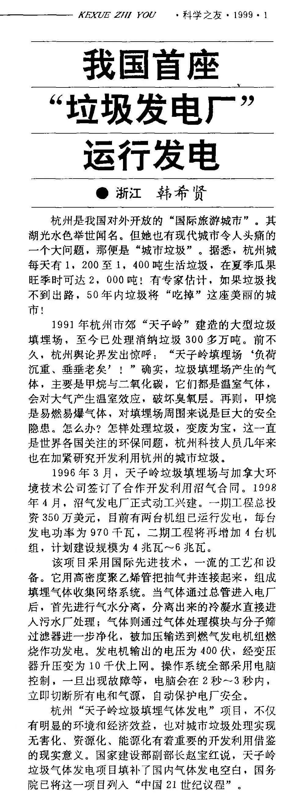 據(jù)當(dāng)時的媒體報道,1996年3月,天子嶺垃圾填埋場與一家加拿大公司簽訂了合作開發(fā)利用沼氣合同。1998年4月,沼氣發(fā)電廠正式動工興建。一期工程總投資350萬美元,安裝兩臺發(fā)電機組,每臺發(fā)電功率為970千瓦,二期工程將再增加4臺機組,計劃建設(shè)規(guī)模為4~6兆瓦。報道原文表示,杭州“天子嶺垃圾填埋氣體發(fā)電”項目不僅有明顯的環(huán)境和經(jīng)濟效益,也對城市垃圾處理實現(xiàn)無害化、資源化、能源化有著重要的開發(fā)利用借鑒的現(xiàn)實意義。時任原建設(shè)部副部長的趙寶紅說,天子嶺垃圾氣體發(fā)電項目填補了國內(nèi)氣體發(fā)電空白,國務(wù)院已將這一項目列入“中國21世紀(jì)議程”。天子嶺垃圾填埋場的設(shè)計、施工、運維及其在滲濾液處理、沼氣發(fā)電等方面的一系列創(chuàng)新,堪稱是中國生活垃圾衛(wèi)生填埋技術(shù)發(fā)展史的一部“縮影”。在1990年代前后,國內(nèi)先后建成了上海老港生活垃圾填埋場、蘇州市七子山生活垃圾填埋場、濟南市生活垃圾無害化處理廠等一批大型生活垃圾衛(wèi)生填埋設(shè)施,導(dǎo)引著中國生活垃圾處理進入“衛(wèi)生填埋”新時代。而在那之前,我們的生活垃圾還只能簡單堆放、簡易填埋,甚至直接傾倒入河流、海洋。可以說,生活垃圾“衛(wèi)生填埋”是國內(nèi)首個徹底改變?nèi)珖罾幚憩F(xiàn)狀的新技術(shù),地位絕不啻于后來風(fēng)行的垃圾焚燒發(fā)電。從1991年到2020年,包括一埋場和二埋場在內(nèi),整個天子嶺垃圾填埋場總計處理生活垃圾近3000萬噸。隨著杭州市生活廢棄物管理轉(zhuǎn)型升級,杭州市生活垃圾處理逐漸形成“焚燒為主、資源化為輔、填埋為保障”的新格局。2020年12月16日23時58分,隨著最后一張覆蓋膜的密閉完成,天子嶺垃圾填埋場正式結(jié)束填埋主力的角色。