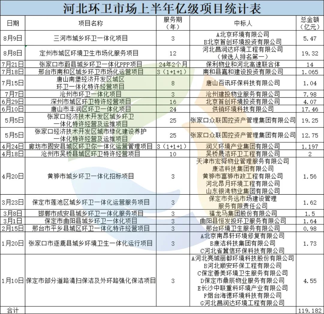 據《環(huán)保圈》不完全統(tǒng)計,2022年1月至今,河北省已開標19個億級環(huán)衛(wèi)項目,中標金額合計119.18億元。(注:數據來源為中國政府采購網及各地政府采購網、招投標公共服務平臺等)而據環(huán)衛(wèi)科技網歷史數據,2021年全年,河北環(huán)衛(wèi)市場僅開標6個億級項目,總金額約為14億元。如今,2022年才過7個多月,中標金額就增長了7.5倍。可見,河北省今年環(huán)衛(wèi)項目釋放量和項目體量較往年都有飛躍式的增長。而從河北各個地區(qū)來看,當屬張家口市項目釋放量最多,共計開標4個項目,中標金額合計47.73億元,約占19個項目總金額的40%。從中標企業(yè)上看,共計29家企業(yè)榜上有名。其中,外地企業(yè)12家,占比約41%。外地企業(yè)對河北環(huán)衛(wèi)市場的“侵蝕”程度可見一斑。此外,中標金額排名前5的項目中,排名3、4的唐山市豐潤區(qū)項目和張家口市蔚縣項目,中標人分別為供銷環(huán)境科技有限公司和保利物業(yè)(牽頭人),均為外地企業(yè)。這兩個項目的中標金額之和為此5個大項目總金額的38%。可見,在上半年的環(huán)衛(wèi)大標爭奪上,外地企業(yè)還是能搶占一席之地的。另一個值得關注的是,在今年的河北環(huán)衛(wèi)市場上,國資控股企業(yè)頗有幾分大放異彩的意味,人數雖少,卻屢屢奪得大標。29家企業(yè)中,有8個中標人為國資控股企業(yè),此8家企業(yè)中標金額合計65.98億元,占總金額的55%。如32億元的張家口經濟技術開發(fā)區(qū)2個項目中標人為張家口眾聯(lián)國控資產管理集團有限公司;超17億元的唐山市豐潤區(qū)環(huán)衛(wèi)一體化項目中標人為供銷環(huán)境科技有限公司;近8億元的滄州市環(huán)衛(wèi)一體化項目中標人為滄州建投物業(yè)服務有限公司等,中標人均為國資控股。除了已經中標的項目,目前河北省在招標的億級環(huán)衛(wèi)項目還有5個,預算金額合計超11億元,加上已中標項目,整個河北省環(huán)衛(wèi)項目釋放量已超130億元。與大刀闊斧發(fā)布新項目的前端環(huán)衛(wèi)市場一致的是,河北末端環(huán)衛(wèi)市場也呈現出了一派欣欣向榮的景象。公開信息顯示,2021年底,河北省已經建成69座生活垃圾焚燒發(fā)電廠,全省焚燒總處理能力達6.75萬噸/日,位居全國前列。2022年3月20日,《河北省“十四五”時期“無廢城市”建設工作方案》(以下稱《方案》)下發(fā),提出積極推進生活垃圾無害化處理,加快生活垃圾焚燒處理設施建設,加強生活垃圾填埋場封場治理,實現原生生活垃圾“零填埋”。頂層方案的加碼,讓河北省生活垃圾末端處置的各個項目加快了速度。據河北省住房和城鄉(xiāng)建設廳消息,截止今年7月,河北省計劃建成的17座生活垃圾焚燒處理設施已完成總工程量的67%,已關停生活垃圾填埋場121座,126座填埋場治理任務已開工54座、完工2座,全省生活垃圾焚燒處理率達到90%以上。從這些計劃實施的進程來看,河北省一直在持續(xù)性推進生活垃圾無害化處理工程,補齊生活垃圾焚燒處理能力短板,加快垃圾焚燒處理設施建設??傮w來說,該省生活垃圾末端處置市場未來的發(fā)展態(tài)勢是一片大好。在末端處置的其他方面,河北建筑垃圾資源化利用市場也隨著各項政策的下發(fā)沸騰了起來。2022年1月25日,河北省《關于支持建筑垃圾資源化利用若干政策措施》下發(fā),提出了三大方面十七項政策措施。文件要求,建筑垃圾處置費收費標準原則上不低于6元/m3。房屋建筑工程中使用再生砌塊(磚)等產品占同種類產品的比例不低于10%;市政基礎設施工程中使用再生粗骨料、再生砌塊(磚)、再生瀝青混凝土等產品占同種類產品的比例不低于20%。此外,鼓勵在房屋建筑、市政基礎設施、交通基礎設施、海綿城市、園林景觀等各類工程建設中,優(yōu)先選用符合技術標準和設計、質量要求的建筑垃圾再生產品。政府投資或以政府投資為主的工程項目,優(yōu)先使用建筑垃圾再生產品,做到能用盡用。2022年3月16日,河北省住房和城鄉(xiāng)建設廳對《河北省建筑垃圾資源化利用技術導則》公開征求意見,4月6日,該《導則(2022年版)》正式發(fā)布,主要包括建筑垃圾資源化利用方案策劃、分類收集、運輸與轉運、處理、再生產品的應用等內容。《導則》在2019年版基礎上增加了方案策劃、水泥窯協(xié)同處置建筑垃圾、再生骨料用于水處理生物填料等內容。導則提出,建筑垃圾應從源頭分類,應按成分進行資源化利用,處理全過程不得混入生活垃圾、污泥、河道疏浚底泥、工業(yè)垃圾和危險廢物等。在處理及利用環(huán)節(jié),建筑垃圾物料進廠至再生產品出廠的各環(huán)節(jié)應配備計量裝置,按進廠量和實際利用量分別計量和統(tǒng)計,并計算建筑垃圾資源化利用率,進廠建筑垃圾的資源化利用率不應低于95%。而先前提到的《河北省“十四五”時期“無廢城市”建設工作方案》也特別點出,要加強重點環(huán)節(jié)管控,推進建筑垃圾多維綜合利用。一是要求推進建筑垃圾源頭減量,落實建設單位建筑垃圾減量化主體責任,將建筑垃圾減量化措施費用納入工程概算。二是推進建筑垃圾多渠道消納。如在土方平衡、林業(yè)用土、環(huán)境治理、燒結制品及回填等領域,推廣使用經處理后的建筑垃圾。比如,在城市更新和存量住房改造建設中,特別是政府投資或以政府投資
