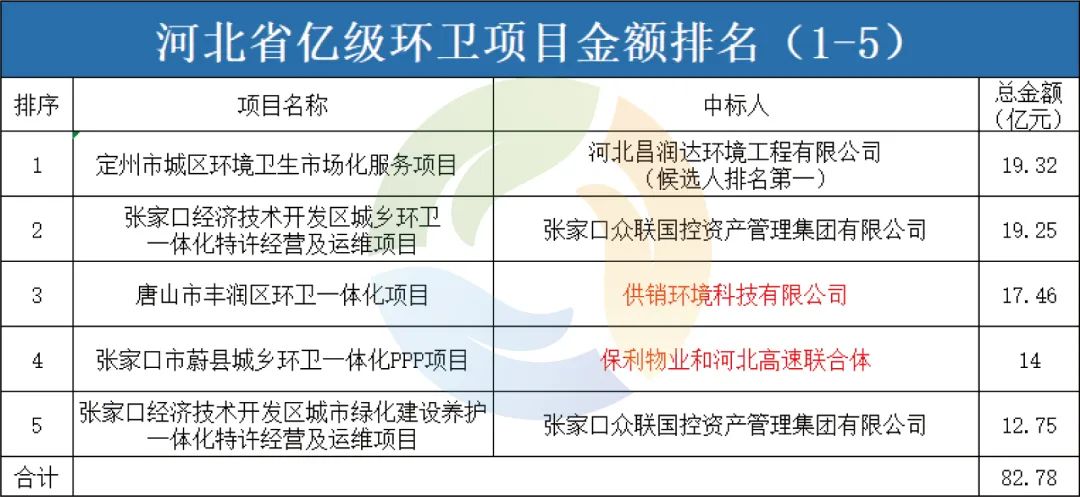 8月8日,超19億元的定州市城區(qū)環(huán)境衛(wèi)生市場化服務項目公布中標候選人公示,河北昌潤達環(huán)境工程有限公司排名第一;8月9日,約5.5億元三河市城鄉(xiāng)環(huán)衛(wèi)一體化項目又被北京環(huán)境有限公司和北京首創(chuàng)環(huán)境投資有限公司攜手斬獲。至此,河北省今年已開標的億級環(huán)衛(wèi)項目總金額已超119億元,加上在招標項目,河北省今年環(huán)衛(wèi)項目的釋放量已超130億元!不僅如此,進入2022年之后,河北省在生活垃圾末端處置方面的發(fā)展也較為迅速,主要體現在生活垃圾焚燒項目、建筑垃圾資源化利用項目等方面。而這一切的“大爆發(fā)”,和地方“十四五”時期各項規(guī)劃及相關政策有密切聯(lián)系??梢源竽懙仡A測,未來5年,河北將是環(huán)衛(wèi)企業(yè)競相爭奪的“圣地”。項目釋放量突破130億,國資控股企業(yè)大放異彩