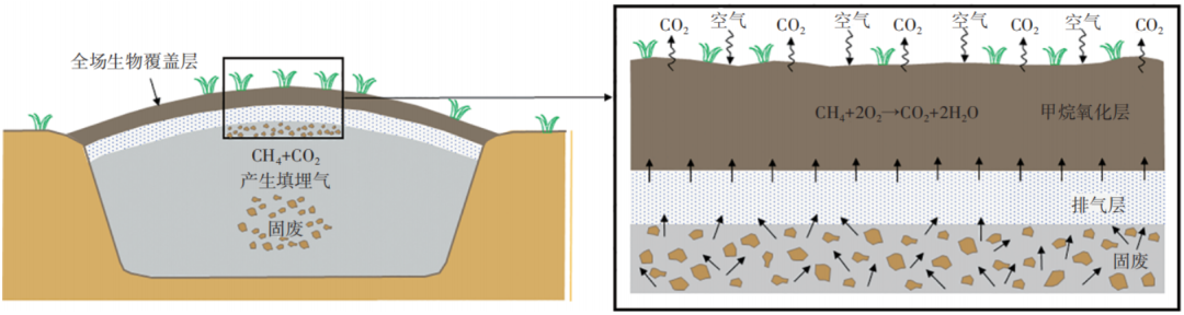 生態(tài)型土質(zhì)覆蓋層具有良好的閉氣功能,能夠有效降低填埋氣排放。同時(shí)由于土體多孔的特性,生態(tài)型土質(zhì)覆蓋層不會(huì)完全阻斷填埋氣向大氣遷移,而且覆蓋層土壤中廣泛存在分解污染性填埋氣的微生物,這些微生物以污染性填埋氣為“糧食”,能夠?qū)崿F(xiàn)填埋場(chǎng)長(zhǎng)效碳減排(圖6)。