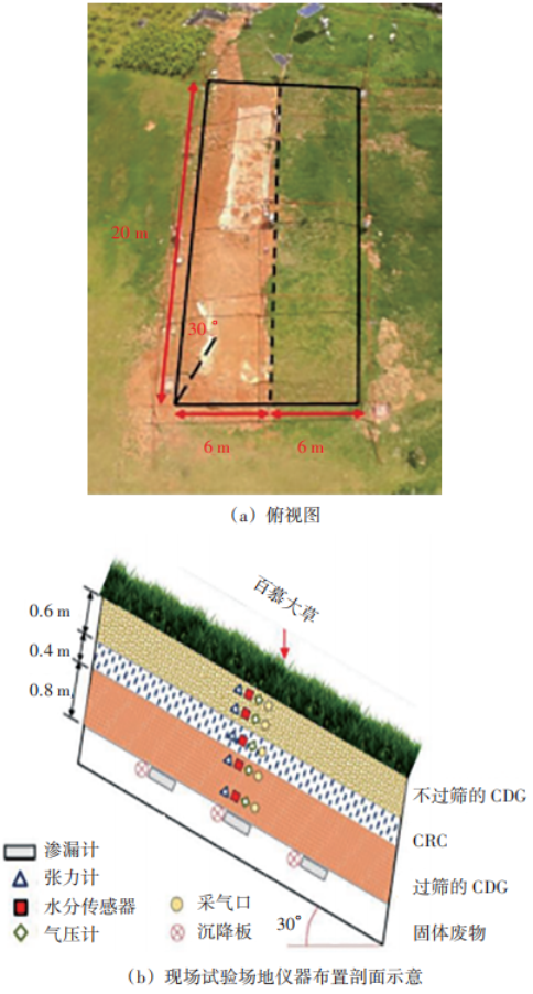 圖9 深圳下坪垃圾填埋場(chǎng)現(xiàn)場(chǎng)試驗(yàn)場(chǎng)俯視圖及現(xiàn)場(chǎng)試驗(yàn)場(chǎng)地儀器布置剖面示意