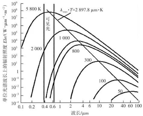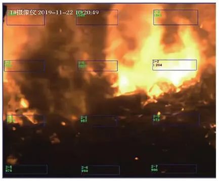 根據(jù)普朗克(Plank)黑體輻射定律,自然界的任何物體只要溫度高于絕對(duì)零度(-273.15 ℃),就會(huì)以電磁輻射的形式在非常寬的波長(zhǎng)范圍內(nèi)發(fā)射能量,產(chǎn)生電磁波(輻射能)。不同的材料、溫度、表面光度及顏色,發(fā)出的紅外輻射強(qiáng)度都不同,大氣電磁光譜示意見(jiàn)圖4。普朗克輻射定律給出了黑體輻射的具體譜分布,在一定溫度下,單位面積的黑體在單位時(shí)間、單位立體角內(nèi)和單位波長(zhǎng)間隔內(nèi)輻射出的能量見(jiàn)公式(1):式中:B(λ,T)為黑體的光譜輻射亮度(W?m-2?Sr-1?μm-1);T為黑體的絕對(duì)溫度(K);c為光速,c=2.998×108 m/s;h為普朗克常數(shù),h=6.626×10-34 J?s;K為波爾茲曼常數(shù),K=1.380×10-23 J/K。在一定溫度下,黑體的光譜輻射亮度存在一個(gè)極值,這個(gè)極值的位置與溫度有關(guān),這就是維恩位移定律(Wien):式中:λmax為最大黑體光譜輻射亮度處的波長(zhǎng)(μm);T為黑體的絕對(duì)溫度(K);b為維恩常量,b=0.002 897 m·K(2.897×103μm·K)。根據(jù)Wien定律,我們可以估算,當(dāng)T=6 000 K時(shí),λmax為0.48 μm(綠色),這就是太陽(yáng)輻射中大致的最大光譜輻射亮度處。當(dāng)T=300 K,λmax=9.6 μm,這就是地球物體輻射中大致最大光譜輻射亮度處。普朗克定律描述的黑體輻射在不同溫度下的頻譜見(jiàn)圖5。根據(jù)圖5中數(shù)據(jù),可以得到如下結(jié)論:隨著溫度升高,輻射能量增加,這是紅外輻射理論的出發(fā)點(diǎn),也是單波段紅外測(cè)溫設(shè)計(jì)的依據(jù)。隨著溫度升高,輻射峰值波長(zhǎng)向短波方向移動(dòng),其規(guī)律符合Wien定律,即λmax?T=2 897.8 μm?K。這個(gè)公式解釋了為什么“高溫測(cè)溫儀”多采用短波,“低溫測(cè)溫儀”多采用長(zhǎng)波。輻射能量隨溫度的變化率,短波比長(zhǎng)波大,即短波處工作的“測(cè)溫儀”相對(duì)信噪比高,抗干擾性強(qiáng)。由Wien定律可以得出,溫度越高,輻射峰值的波長(zhǎng)越短。所以為了使輻射接收器有一個(gè)較理想的信噪比,對(duì)于溫度越低的物體,可測(cè)量的輻射波長(zhǎng)越長(zhǎng)。近年來(lái),利用光電轉(zhuǎn)換元件(Charge Coupled Device,CCD),即“電荷耦合元件”測(cè)量和監(jiān)測(cè)火焰溫度的方法受到越來(lái)越多的關(guān)注,國(guó)內(nèi)外先后開(kāi)展了大量研究。CCD用于將鏡頭收集到的光信號(hào)轉(zhuǎn)變?yōu)殡娦盘?hào)從而進(jìn)行進(jìn)一步處理。日本因其先進(jìn)的電子技術(shù)及對(duì)環(huán)保的強(qiáng)烈意識(shí),最先在燃燒診斷中應(yīng)用了數(shù)字圖像處理技術(shù)。法國(guó)的Renier等通過(guò)CCD相機(jī)獲得物體表面圖像,隨后通過(guò)黑體爐標(biāo)定并利用輻射定律來(lái)得到輻射物體表面參數(shù),同時(shí)他們將濾光片加在CCD相機(jī)前來(lái)提高系統(tǒng)的靈敏性并擴(kuò)大測(cè)溫范圍。我國(guó)生活垃圾焚燒火焰產(chǎn)生的固體顆粒物主要為炭黑顆粒和飛灰,火焰面內(nèi)部固體顆粒為炭黑顆粒,而飛灰主要彌散在火焰面外部。炭黑顆粒相較于飛灰具有更小的結(jié)構(gòu)尺寸,意味著其擁有更大的比表面積,即更大的輻射表面積,進(jìn)而擁有更強(qiáng)的發(fā)射輻射能力。因此生活垃圾焚燒火焰連續(xù)光譜強(qiáng)度主要由其中的炭黑顆粒主導(dǎo)。生活垃圾焚燒后氣體產(chǎn)物如H2O、CO2、CO、NO等物質(zhì)的發(fā)射光譜多分布在近紫外和遠(yuǎn)紅外區(qū)域,而在λ為0.5~0.9 μm波段上很少有發(fā)射光譜存在,對(duì)于本系統(tǒng)的測(cè)溫效果幾乎沒(méi)有干擾。因此,在λ=0.5~0.9 μm波段上炭黑顆??杀徽J(rèn)為是火焰發(fā)射輻射的主導(dǎo)者,進(jìn)而將生活垃圾焚燒火焰輻射特性的研究轉(zhuǎn)變?yōu)槠渲刑亢陬w粒輻射特性的研究。而垃圾焚燒爐內(nèi)測(cè)量區(qū)域的火焰及煙氣溫度基本在700~1 200 ℃,對(duì)應(yīng)的黑體絕對(duì)溫度在973~1 473 K(圖5),此溫度下黑體輻射最強(qiáng)的波段集中在短波區(qū)域,因此為適應(yīng)垃圾焚燒爐的特性需要采取短波高溫?zé)岢上駜x。綜上所述,最終本系統(tǒng)選取的CCD響應(yīng)光譜范圍在0.4~1.0 μm,其中0.4~0.8 μm為可見(jiàn)光圖像, 0.8~1.0 μm的近紅外光用于測(cè)溫。對(duì)于垃圾焚燒來(lái)說(shuō),在0.4~1.0 μm波長(zhǎng)區(qū)間主要存在的化學(xué)發(fā)光來(lái)自于Na、K、Rb等堿金屬的特征譜線,而這些譜線的波長(zhǎng)大都≤0.8 μm,所以對(duì)用于測(cè)溫的0.8~1.0 μm波段影響較小。針對(duì)垃圾焚燒應(yīng)用環(huán)境存在爐溫波動(dòng)大、閾值范圍廣的現(xiàn)象,可以通過(guò)軟件對(duì)爐內(nèi)溫度閾值進(jìn)行設(shè)置,實(shí)現(xiàn)超溫報(bào)警、低溫報(bào)警,以實(shí)現(xiàn)當(dāng)爐內(nèi)局部的“熱點(diǎn)”溫度過(guò)高或者局部爐溫降低時(shí),分別通過(guò)降風(fēng)、減料和增風(fēng)、加料等操作來(lái)改善爐內(nèi)工況。某項(xiàng)目單臺(tái)750 t/d焚燒爐紅外成像畫面見(jiàn)圖6。因紅外探頭由焚燒爐后拱俯視爐內(nèi),所呈現(xiàn)的畫面并非為整體的火焰鋒面,而是分散的柱狀火焰。同區(qū)域火焰亮度、高度有明顯差異。相比爐膛火焰監(jiān)視器呈現(xiàn)的豎直火焰鋒面在縱向深度上有更為廣泛的視角跨度。圖6中所示藍(lán)色方框區(qū)域內(nèi)綠色數(shù)字為該點(diǎn)區(qū)