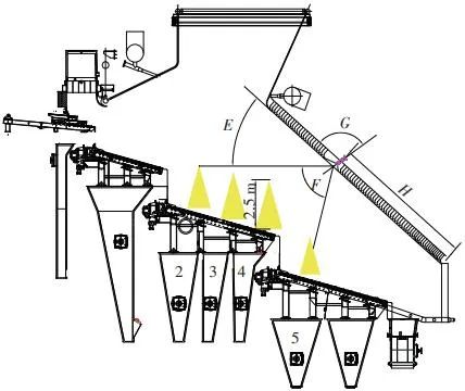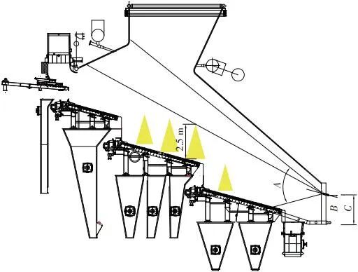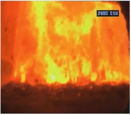 當(dāng)前生活垃圾焚燒爐廣泛采用的爐膛火焰監(jiān)視系統(tǒng)基本上都是由早期應(yīng)用在水泥廠、鋼鐵廠的加熱爐、退火爐和氧化鋁廠等行業(yè)內(nèi)的高溫看火工業(yè)電視演變升級(jí)而來(lái)。內(nèi)窺式數(shù)字高清爐膛火焰監(jiān)視系統(tǒng)成像裝置主要由耐高溫針孔電動(dòng)鏡頭、寶石物鏡、光學(xué)濾光片、光圈焦距調(diào)節(jié)器等組成,配有電控推進(jìn)器、氣源控制柜、光端機(jī)等輔助設(shè)備。其核心問(wèn)題是如何在生活垃圾焚燒爐的高溫、多塵、強(qiáng)腐蝕環(huán)境中長(zhǎng)周期穩(wěn)定運(yùn)行,保證火焰畫面不丟包、不失真。1)優(yōu)勢(shì)特性分析。一是技術(shù)成熟、運(yùn)行穩(wěn)定。隨著我國(guó)近一二十年間生活垃圾發(fā)電廠的興建,爐膛火焰監(jiān)視系統(tǒng)的技術(shù)也處于不停地優(yōu)化和迭代之中,目前已能滿足穩(wěn)定、可靠的要求。其中常規(guī)配置參數(shù)為攝像頭300 萬(wàn)像素,響應(yīng)時(shí)間2 s,光圈(F數(shù))1.6,焦距2.4 mm。二是工作環(huán)境好。爐膛火焰監(jiān)視器探頭通常安裝于焚燒爐后墻,所處位置是垃圾燃燒最末端,常規(guī)工況下探頭周圍煙氣溫度通常<600 ℃。較之焚燒爐其他高溫環(huán)境已算“宜居地帶”。三是維護(hù)量小。焚燒爐后墻幾乎沒(méi)有結(jié)焦現(xiàn)象,常規(guī)爐膛火焰監(jiān)視探頭開(kāi)孔位置僅存有因爐膛偶爾正壓時(shí)煙氣外冒造成的積灰,積灰量不大,清理工作較為輕松。2)劣勢(shì)特性分析。一是參數(shù)單一。因垃圾焚燒行業(yè)爐型構(gòu)造和燃燒成分的特殊性,垃圾焚燒爐長(zhǎng)期采用的火焰探頭利用的是光學(xué)成像原理,運(yùn)行人員僅能通過(guò)觀察火焰形狀和位置來(lái)判斷焚燒爐工況,無(wú)法得到多維度參數(shù)。二是視角局限。爐膛火焰探頭通常位于焚燒爐后墻,安裝角度朝向爐內(nèi)成斜向上方向,與水平線夾角15°左右,探頭視場(chǎng)角通常>60°。以某大型列動(dòng)順推爐排焚燒爐為例,在此仰視角度下可以看到爐排燃燒段尾部、燃燼段前部?jī)擅婷黠@的火焰幕墻,由于火焰鋒面遮擋,很難觀察到燃燒段中前部的火焰狀況。 以某單臺(tái)750 t/d大型列動(dòng)順推爐排焚燒爐中爐膛火焰監(jiān)視器安裝位置和顯示畫面為實(shí)例,具體分析火焰成像狀態(tài)。其實(shí)際火焰成像畫面見(jiàn)圖1。成像角度是由焚燒爐后墻探頭位置向上仰視爐膛。因焚燒工況十分良好,靠近后墻的燃燼段區(qū)域幾乎沒(méi)有明火,燃燒段尾部成一面豎直、光亮的黃紅色火焰鋒面,高度約為2.5 m。對(duì)應(yīng)的爐膛火焰監(jiān)視器安裝示意如圖2所示。爐膛火焰探頭安裝在焚燒爐后墻,安裝位置與后墻觀火平臺(tái)地面距離為C(m)。開(kāi)孔傾角與水平方向夾角為B(°),有效視場(chǎng)角為A(°)。圖2中由黃色填充的三角形區(qū)域代表正常燃燒火焰,其中標(biāo)注高度2.5 m的區(qū)域?yàn)槿紵隣t排尾部火焰,即為圖1所顯示的火焰鋒面。顯然,從爐膛火焰監(jiān)視器向上望去,燃燒段前部、中部火焰為視野盲區(qū)。由于被燃燒段尾部火焰鋒面遮擋,通過(guò)火焰監(jiān)視器通常只能看到燃燒段尾部、燃燼段前部這兩個(gè)區(qū)域的火焰。