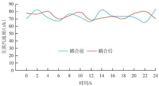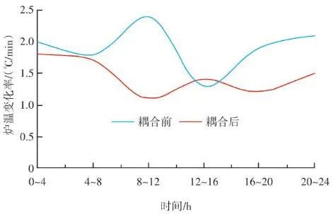 生活垃圾焚燒爐的排放物在滿足GB 18485—2014 生活垃圾焚燒污染控制標(biāo)準(zhǔn)的前提下,為保障焚燒爐的長(zhǎng)期安全運(yùn)行、汽機(jī)系統(tǒng)的穩(wěn)定高效運(yùn)轉(zhuǎn),通常通過(guò)爐溫和主蒸汽流量這兩個(gè)因素來(lái)判斷鍋爐運(yùn)行是否良好。以下工況為某項(xiàng)目單臺(tái)750 t/d生活垃圾焚燒爐在紅外熱成像管理系統(tǒng)應(yīng)用前、應(yīng)用后兩段時(shí)期的實(shí)際運(yùn)行參數(shù),以此實(shí)例來(lái)解析該系統(tǒng)的運(yùn)行效果。該項(xiàng)目額定主蒸汽流量為74 t/h。如圖10所示,藍(lán)色實(shí)線為耦合前24 h變化率波動(dòng)范圍,紅色實(shí)線為耦合后24 h變化率波動(dòng)范圍。爐溫變化率指的是焚燒爐上、中、下3層共計(jì)9個(gè)溫度測(cè)點(diǎn)的熱電偶反饋溫度在每分鐘內(nèi)升高或降低的溫度值,而溫度變化率波動(dòng)范圍指的是單位時(shí)間內(nèi)溫度變化率最高值與最低值之間的溫度差,該差值越大表明爐溫波動(dòng)越大,即工況越不穩(wěn)定,波動(dòng)范圍越小表明工況越平穩(wěn)。此期間溫度也一直未低于環(huán)保部要求的最低限(850 ℃/2 s),均介于950~1 050 ℃。焚燒爐主蒸汽流量曲線如圖11所示,左側(cè)縱坐標(biāo)為主蒸汽流量,額定蒸發(fā)量74 t/h。圖中藍(lán)色實(shí)線為紅外熱成像系統(tǒng)與ACC系統(tǒng)耦合前24 h的主蒸汽流量曲線,紅色虛線為紅外熱成像系統(tǒng)與ACC系統(tǒng)耦合后24 h的主蒸汽流量曲線。表1中參數(shù)可以計(jì)算出耦合前后焚燒爐爐溫波動(dòng)范圍相對(duì)縮減了24.5%,焚燒爐爐溫均值提高了1.2%,蒸發(fā)量波動(dòng)幅度縮減了3個(gè)百分點(diǎn),主蒸汽流量提高了1.4 t/h。經(jīng)過(guò)對(duì)主要運(yùn)行參數(shù)的定量分析,可以看出結(jié)合了紅外熱成像系統(tǒng)的ACC系統(tǒng)在功能性和穩(wěn)定性上有顯著提升。表1 重要運(yùn)行參數(shù)統(tǒng)計(jì)基于目前紅外熱成像管理系統(tǒng)的功能,正在逐步進(jìn)行焚燒爐溫度場(chǎng)重構(gòu)工作,對(duì)于紅外探頭收集的大量溫度點(diǎn)實(shí)時(shí)數(shù)據(jù)進(jìn)行整合并進(jìn)行紅外溫度顯示。傳感器擁有1 440×1 080個(gè)像素,其中每個(gè)像素都有對(duì)應(yīng)的溫度值,該溫度值隨著目標(biāo)溫度的變化在800~1 600 ℃對(duì)應(yīng)變化,那么我們就可以將800~1 600 ℃這個(gè)范圍內(nèi)的溫度數(shù)據(jù)映射到顏色空間中特定的彩色序列,只要在程序中明確規(guī)定溫度和顏色之間的映射函數(shù)和映射表即可實(shí)現(xiàn)相應(yīng)的偽彩顯示,即熱像圖的形式。這樣可為運(yùn)行人員提供更為直觀、立體的參考依據(jù),待溫度場(chǎng)重構(gòu)系統(tǒng)成熟后,再與ACC系統(tǒng)進(jìn)行結(jié)合,進(jìn)一步提高全廠的自動(dòng)化程度。紅外熱成像管理系統(tǒng)在生活垃圾焚燒控制領(lǐng)域,與傳統(tǒng)ACC系統(tǒng)經(jīng)過(guò)合理的設(shè)計(jì)、安裝、邏輯耦合后,對(duì)焚燒自動(dòng)化有以下幾個(gè)方面的改變和提升。1)視野擴(kuò)大。改變探頭安裝位置后,成像角度由仰視變?yōu)楦┮?,拓寬了爐內(nèi)火焰視場(chǎng)角度。火焰成像形狀由“一面火墻” 提升為“一片火?!薄T诰邆渥罨镜摹斑h(yuǎn)程看火”功能前提下,為運(yùn)行人員提供更強(qiáng)有力的參考依據(jù)。2)測(cè)溫準(zhǔn)確。紅外熱成像原理相比傳統(tǒng)光學(xué)成像原理,增加了溫度反饋功能。利用軟件管理系統(tǒng),將溫度信號(hào)解析,并與實(shí)際區(qū)域一一對(duì)應(yīng)。3)靈活性高。溫度測(cè)點(diǎn)的選定可通過(guò)管理軟件任意選擇,調(diào)試結(jié)束后仍可根據(jù)實(shí)際工況進(jìn)行設(shè)置和改變。4)耦合性強(qiáng)。紅外熱成像管理系統(tǒng)除現(xiàn)有功能外更像是一個(gè)平臺(tái),可以對(duì)現(xiàn)有溫度參數(shù)和火焰狀態(tài)的大量數(shù)據(jù)進(jìn)行進(jìn)一步提升和利用,例如正在進(jìn)行的溫度場(chǎng)成像功能優(yōu)化和升級(jí)工作。5)效益提升。紅外熱成像管理系統(tǒng)融入ACC系統(tǒng)后,對(duì)焚燒爐溫度、鍋爐主蒸汽流量的穩(wěn)定性有顯著提升。對(duì)減少運(yùn)行人員工作量、增加產(chǎn)汽量、發(fā)電量等焚燒廠經(jīng)濟(jì)效益方面有不同程度提升。