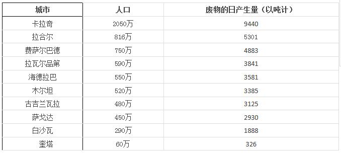 巴基斯坦主要城市的廢物產(chǎn)生情況