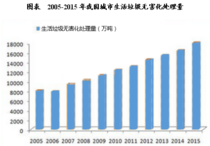 2005-2015年間,我國(guó)城市生活垃圾無(wú)害化處理量年均復(fù)合增長(zhǎng)率(CAGR)為8.38%。