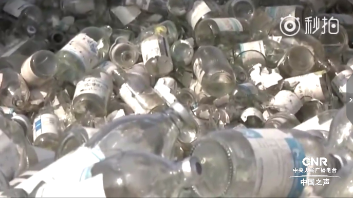 龔恩東:他的來源,涉及到南京十幾家醫(yī)院每個醫(yī)院大概在10噸左右,收了以后他進行簡單地分類,輸液瓶歸輸液瓶,輸液袋歸輸液袋。