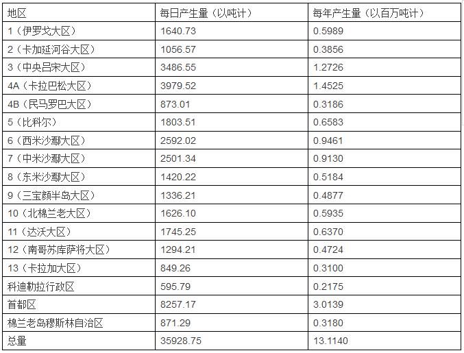 下方的圖表展示的是菲律賓全國各地區(qū)的廢物產(chǎn)生量,數(shù)據(jù)的來源是國家固廢管理委員會(huì)秘書處。數(shù)據(jù)是通過計(jì)算各地區(qū)人均廢物產(chǎn)生量和人口的乘積得到的。平均來說,在城市區(qū)域和農(nóng)村區(qū)域,人均廢物產(chǎn)生量分別為0.5kg/天和0.3千克/天。在首都區(qū),也就是馬尼拉大都市區(qū)的所在地,人均廢物產(chǎn)生量最高,為0.71千克/人/天。