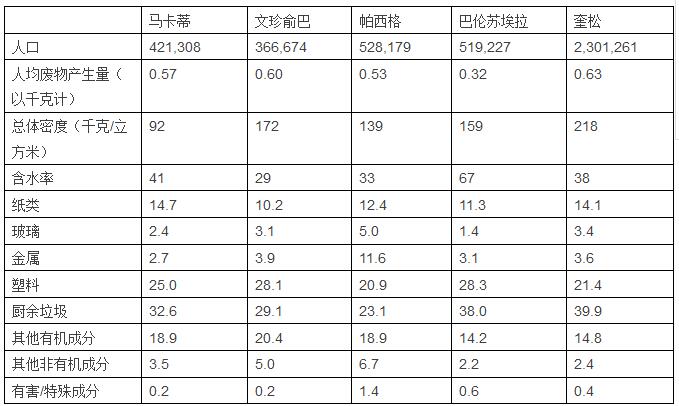 可以看出,在每座城市中,廚余垃圾以及其他的有機(jī)廢物都占到了廢物總產(chǎn)生量的大約50%??裳h(huán)利用的成分占到了42-49%,其中塑料占總量的21-28%。其他非有機(jī)成分和特殊成分則分別占到了2-6%和0.2-1.4%。