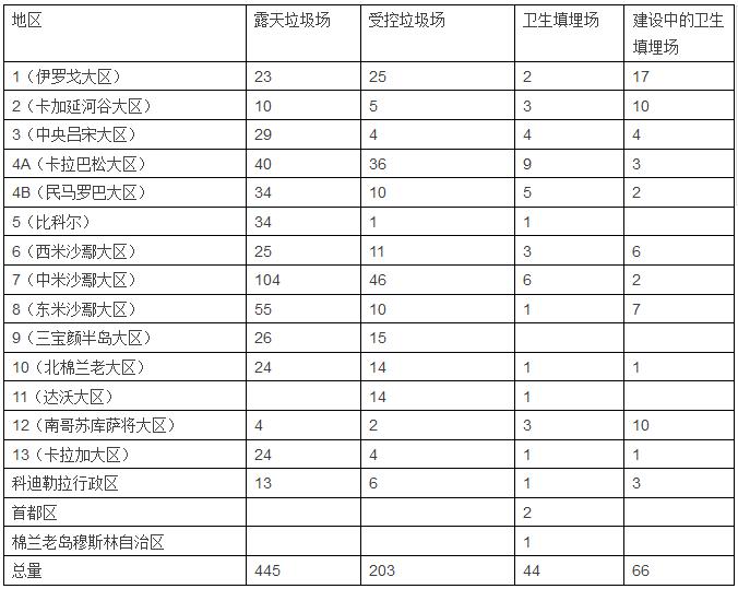 2012年時(shí)菲律賓全國垃圾場和填埋場在各大區(qū)的分布情況
