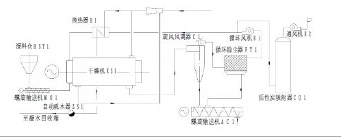 如圖1 ,污泥的蒸汽熱干化技術(shù)采用以工 業(yè)蒸汽為干燥介質(zhì),通過(guò)污泥干燥機(jī)將含水率 為7 0 % 的污泥經(jīng)螺旋輸送機(jī)(M01 )送達(dá)污泥 干燥機(jī)(ES1),來(lái)自工業(yè)用中壓蒸汽將乏氣(由 污泥干后形成的廢氣)加熱至110℃,送入干燥 機(jī)(E S 1 )的入口,與入口污泥進(jìn)行混合預(yù)熱, 同時(shí),在干燥機(jī)(ES1)筒體外殼內(nèi)通入工業(yè)用 中壓蒸汽,作為污泥干燥的主要熱源,采用與 污泥逆流換熱的方式進(jìn)行熱量傳導(dǎo),干燥后的 污泥與干燥過(guò)程中產(chǎn)生的乏氣一起進(jìn)入旋風(fēng)分 離器(C 1 ),其中9 5 % 以上的干燥污泥在旋風(fēng) 分離器(C 1 )中被分離,另外5 % 的污泥與乏 氣在布袋除塵器(F T 1 )中被收集,并共同進(jìn) 入螺旋輸送AC1 輸送出系統(tǒng);被分離出的乏氣, 一部分(約20%)進(jìn)入下一輪污泥干燥循環(huán),另 一部分(約80%)通過(guò)活性炭吸附器(CO1)除臭后排入大氣。