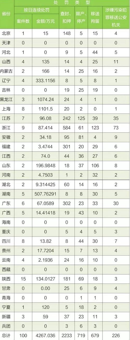 1-9月,全國實施五類案件總數(shù)28708件。同比去年1-9月增長146%。其中,按日連續(xù)處罰案件822件,比去年增長57%。罰款金額達96057.6萬元,比去年增長73%;查封、扣押案件13115件,比去年增長156%;限產(chǎn)、停產(chǎn)案件6420件,比去年增長170%;移送行政拘留6278起,比去年增長172%;移送涉嫌環(huán)境污染犯罪案件2073件,比去年增長53%。