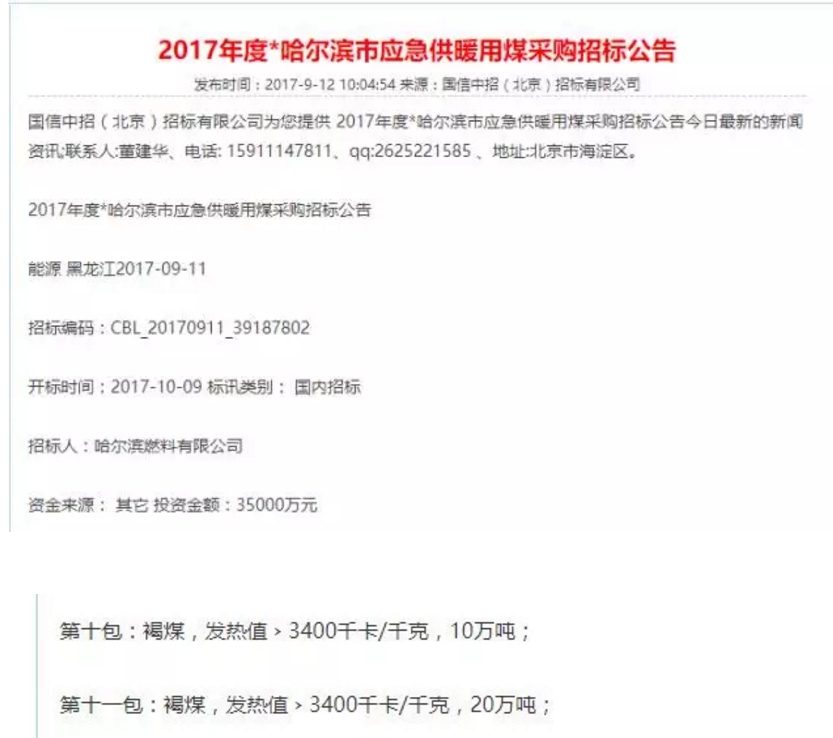 而記者在中國化工產(chǎn)品網(wǎng)上看到,哈爾濱燃料有限公司于今年9月12日發(fā)布了哈市應(yīng)急供暖用煤采購招標(biāo)公告,其中共計(jì)30萬噸褐煤僅要求發(fā)熱值大于3400千卡/千克。在企業(yè)注冊(cè)信息上,該公司經(jīng)營范圍包括煤炭批發(fā)經(jīng)營。