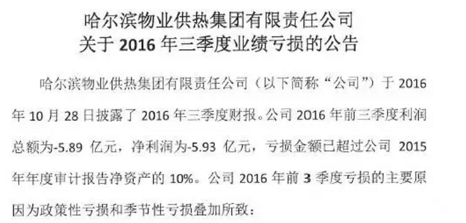 2016年前三季度,哈爾濱物業(yè)供熱集團(tuán)有限公司虧損5.89億元,虧損金額超過其2015年年度審計(jì)報(bào)告凈資產(chǎn)的10%。該公司曾披露,在供熱質(zhì)量和環(huán)保排放質(zhì)量提升的情況下,熱費(fèi)價(jià)格卻隨煤炭價(jià)格走低而下調(diào),政策性虧損為其2016年前三季度虧損主要原因。