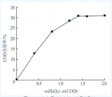 取一定量的廢水,僅加入不同量質量分數為30%的H2O2,考察H2O2的加入量對廢水COD 去除率的影響,結果如圖 1 所示。