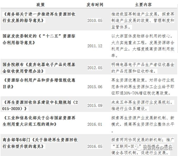 社會(huì)經(jīng)濟(jì)的高速發(fā)展帶來(lái)了國(guó)民生活水平的不斷提高,同時(shí)也伴隨著廢舊物資產(chǎn)生量的大幅上升,為我國(guó)再生資源產(chǎn)業(yè)的發(fā)展提供了良好的發(fā)展機(jī)遇。由于產(chǎn)業(yè)空間巨大,對(duì)社會(huì)經(jīng)濟(jì)以及環(huán)境保護(hù)的推動(dòng)效應(yīng)明顯,近年來(lái)國(guó)家陸續(xù)出臺(tái)多項(xiàng)政策扶持產(chǎn)業(yè)發(fā)展。