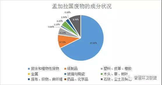 從圖表中可以看出,在孟加拉國的廢物中,有機成分占了很大的比例,超過了70%,導致廢物不僅含水量很高(超過50%),熱值也很低(小于1000千卡/千克)。