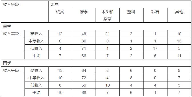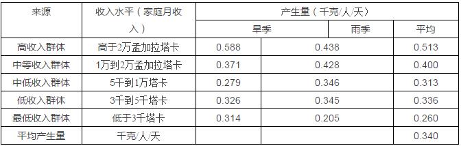 在達卡市,廢物的產生按重量計算,存在旱季和雨季的差別:在雨季,包括有機廢物在內的各類能夠降解的廢物含有更多的水分,所以重量與旱季時相比會更大。此外,不同收入水平的人群廢物的產生量也存在極大的差異:收入最高人群的人均廢物產生量幾乎是收入最低人群的兩倍。