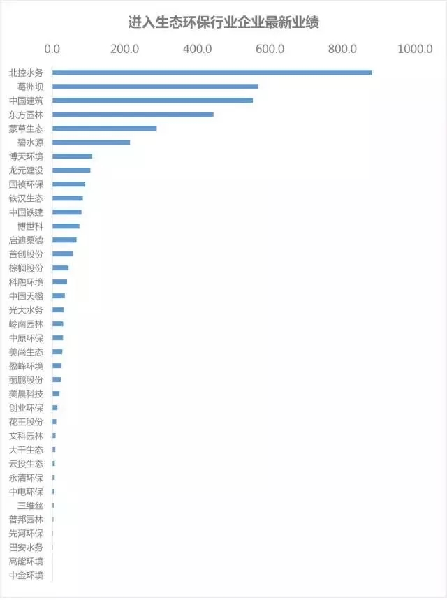 截至2017年10月31日, 36家企業(yè)在生態(tài)環(huán)保領(lǐng)域總中標(biāo)金額達(dá)到4010.3億元,項(xiàng)目數(shù)量達(dá)268個(gè)。國(guó)企中生態(tài)環(huán)保領(lǐng)域業(yè)績(jī)最好的是北控水務(wù),總投資額達(dá)882億元,民企中業(yè)績(jī)最好的是東方園林,總投資額達(dá)444.5億元。