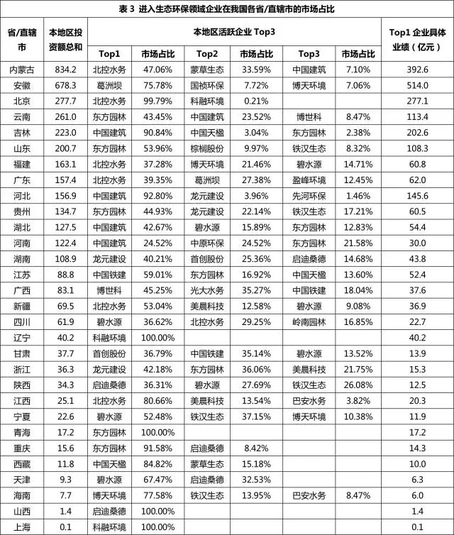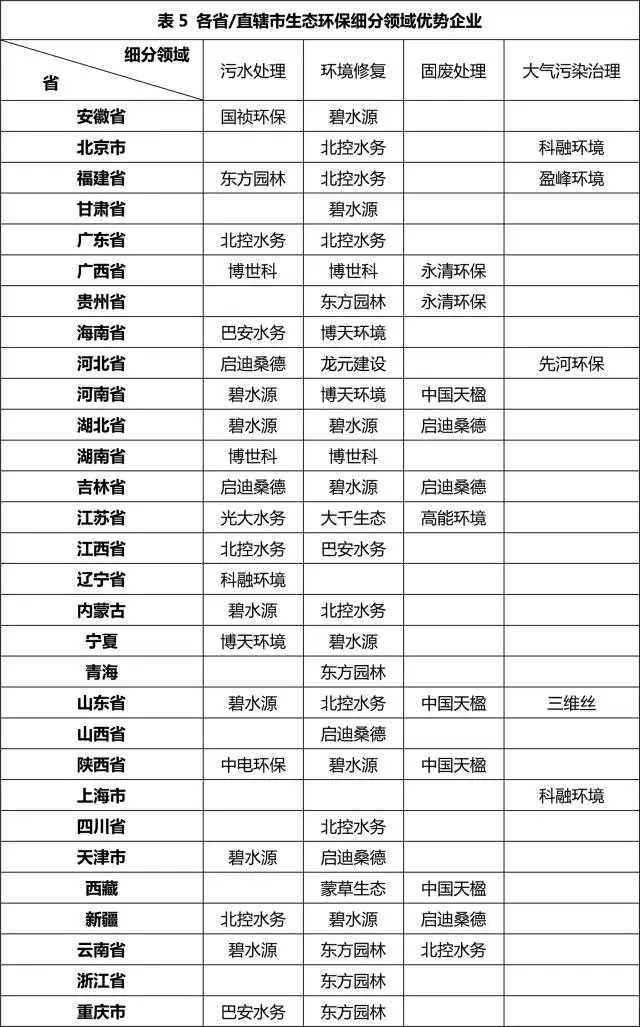 全國(guó)各省/直轄市生態(tài)環(huán)保細(xì)分領(lǐng)域板塊的優(yōu)勢(shì)企業(yè)詳情見(jiàn)表5。