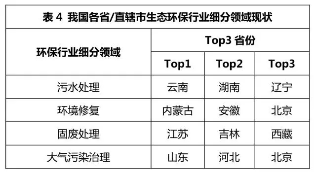 在各省/直轄市生態(tài)環(huán)保行業(yè)細(xì)分領(lǐng)域Top3的省份詳情見(jiàn)表4。