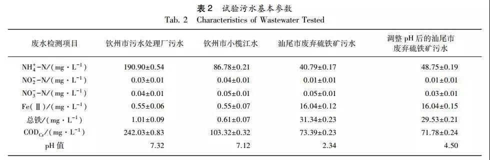 試驗污水分別為廣西壯族自治區(qū)欽州市污水處理廠的生化池進水、欽州市小欖江水以及廣東省汕尾市廢棄硫鐵礦區(qū)的地表水。三種試驗污水的基本理化性質如表2所示。由于汕尾廢棄硫鐵礦污水的pH值比較低,本研究根據(jù)厭氧鐵氨氧化菌生長的適宜pH,在汕尾廢棄硫鐵礦污水中加入氫氧化鈉(1 mol/L),將污水pH調至4.5,后作為第四種試驗廢水參與整個研究(如表2所示)。
