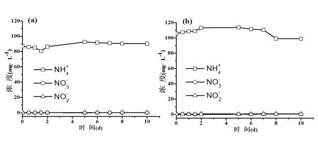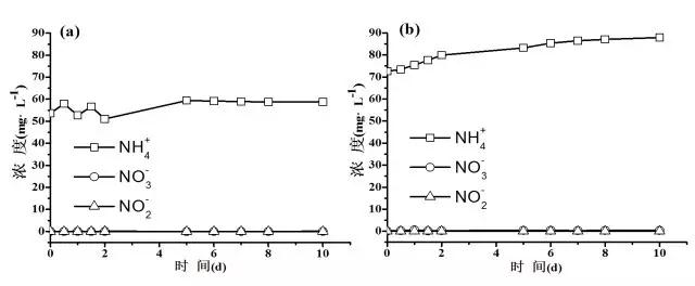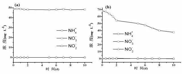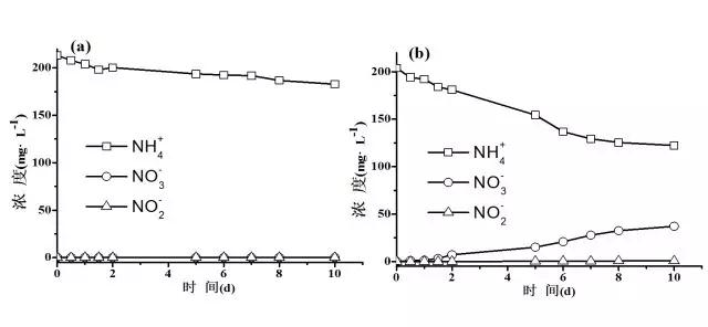 圖1 欽州污水廠進水中氮元素的轉化:(a)未加菌液;(b)添加菌液