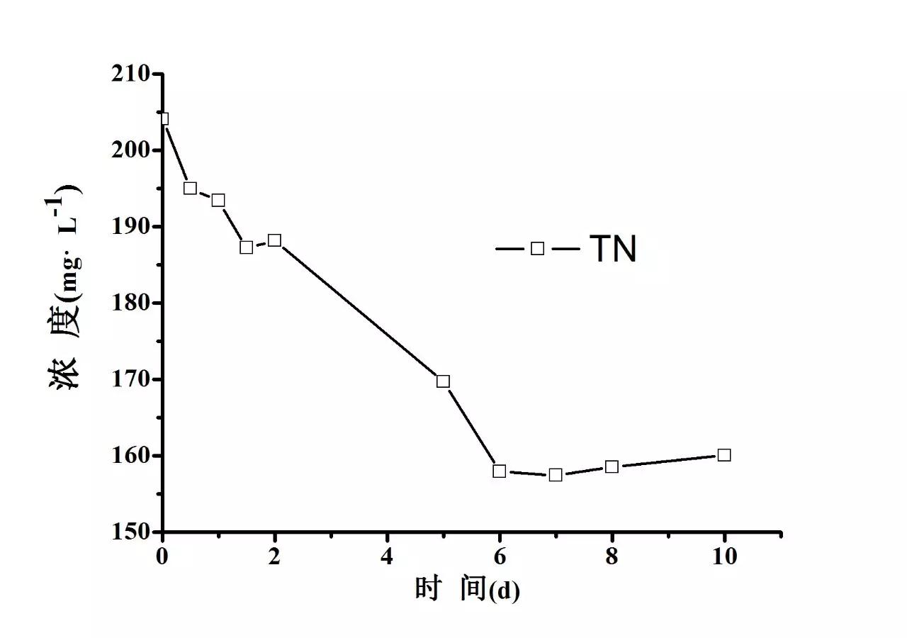 欽州小欖江水中氮的轉化如圖4所示。在培養(yǎng)過程中氨氮的變化分成兩個階段:第一階段為氨氮升高階段(0~5 d),在此階段,污水中的氨氮濃度由初始的105.73 mg/L升至5 d時的113.58 mg/L,加入菌液的污水中氨氮和總氮均升高,原因可能是菌液中部分細菌死亡,釋放出氨氮,導致污水中的氨氮和總氮升高;第二階段為氨氮下降階段(5~10 d),污水中的氨氮濃度由5 d時的113.58 mg/L降至10 d時的98.97 mg/L,與此同時,5~10 d內,水中的硝態(tài)氮沒有明顯變化,而亞硝態(tài)氮由0.05 mg/L增長至0.37 mg/L。根據(jù)加入菌液后總氮的變化(如圖5所示)得出,水中減少的氨氮部分轉化為NO2--N,另一部分極可能轉化為氮氣,轉化量為6.44 mg/L。