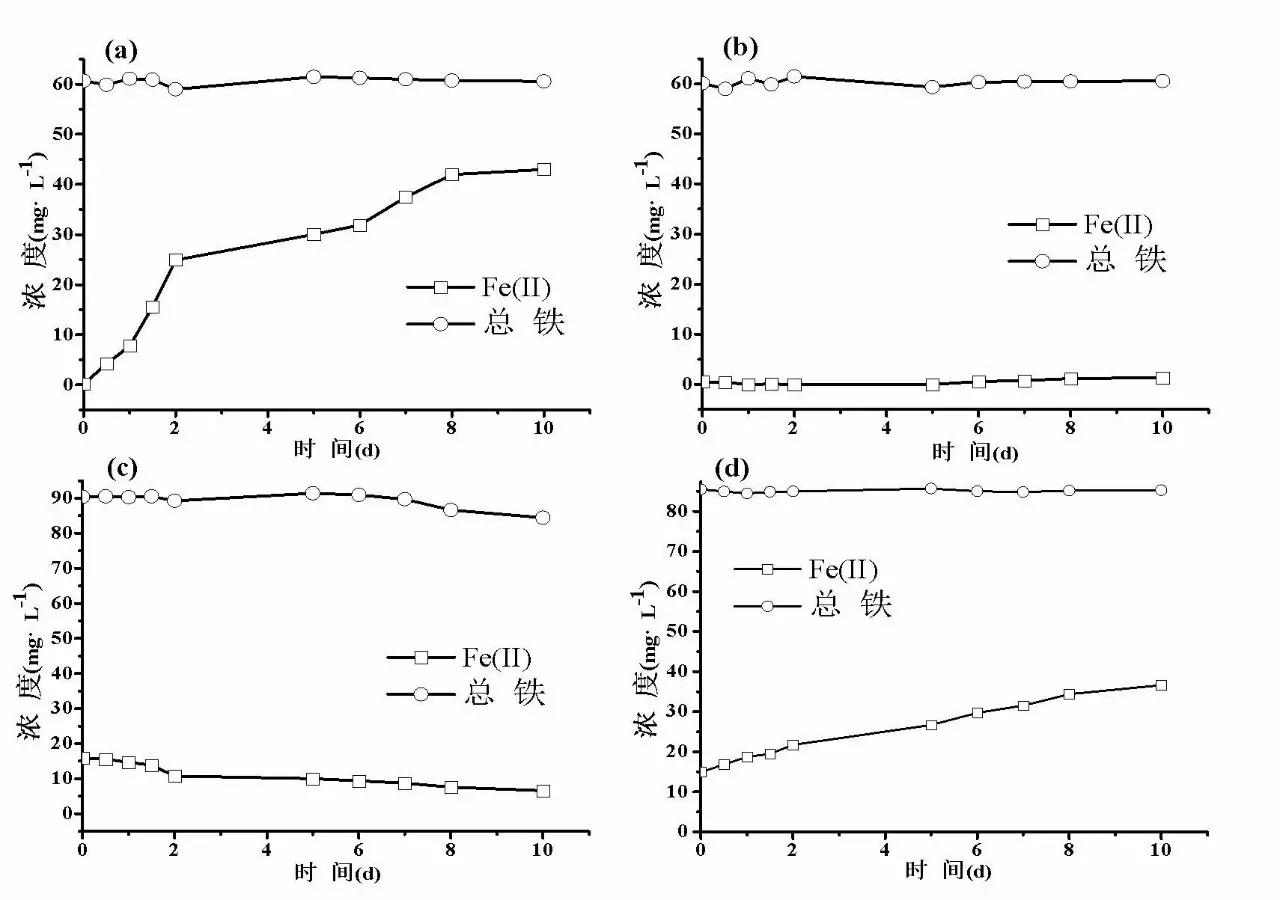 汕尾硫鐵礦廢水中氮元素和鐵形態(tài)的轉化如圖3(c)和圖6所示。對比未加菌液的污水,加菌液污水中的氨氮在0~10 d內逐步升高;而硝態(tài)氮和亞硝態(tài)氮沒有明顯變化。這說明在汕尾廢棄硫鐵礦廢水中并沒有發(fā)生厭氧鐵氨氧化反應。Huang等在研究中得出適宜厭氧鐵氨氧化菌生長pH范圍是4~5,而加入菌液的汕尾廢棄硫鐵礦廢水的初始pH為2.5,遠低于厭氧鐵氨氧化細菌的最佳生長范圍,這可能導致了細菌在一開始就已經(jīng)死亡。