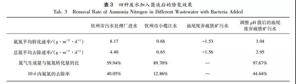 由表3可知,添加菌液后氨氮轉化速率大小依次是欽州污水廠進水、調節(jié)pH后汕尾硫鐵礦廢水和小欖江水,平均速率分別為8.17g˙m-3˙d-1、3.04g˙m-3˙d-1和0.68g˙m-3˙d-1。與氨氮轉化速率大小類似,總氮去除率也是欽州污水廠進水>調節(jié)pH后汕尾硫鐵礦廢水>小欖江水,速率分別為4.4g˙m-3˙d-1、2.95g˙m-3˙d-1和0.65g˙m-3˙d-1。在本試驗中,三種污水加入菌液后氮氣都是氨氮的主要轉化產(chǎn)物。欽州污水廠水、小欖江污水和調節(jié)pH后汕尾硫鐵礦廢水分別為59.94%、89.70%和97.67%。而在10d內欽州污水廠進水、小欖江污水和調節(jié)pH后汕尾硫鐵礦廢水加入菌液后氨氮轉化率分別為40.05%、12.86%和44.64%。