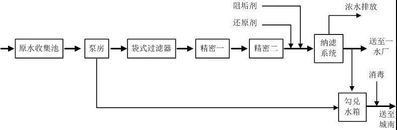 我國中西部地區(qū)水源具有的普遍問題是鹽度(硫酸鹽等)、硬度(鈣鎂含量高)、金屬離子和有機物含量超標(biāo),國內(nèi)一些市政水廠已開始使用納濾法處理高鹽原水。山西省呂梁市六壁頭水廠(運行流程如圖6所示),針對硫酸鹽、硬度高、處理水量大的實際情況,通過方案比選,采用一級兩段式納濾膜處理工藝,處理部分原水再與原水混合的方案,該系統(tǒng)運行情況良好,出水水質(zhì)較好。由流程圖6可以看出,原水取自原水收集池,經(jīng)原水泵升壓后,進入三級過濾器去除大部分懸浮物和膠體,再送入NF系統(tǒng)處理。經(jīng)NF處理后的脫鹽水,部分與剩余原水按一定比例進入勾兌水箱,消毒后加壓外輸至城南;部分脫鹽水通過原輸水管道重力自流至一水廠。