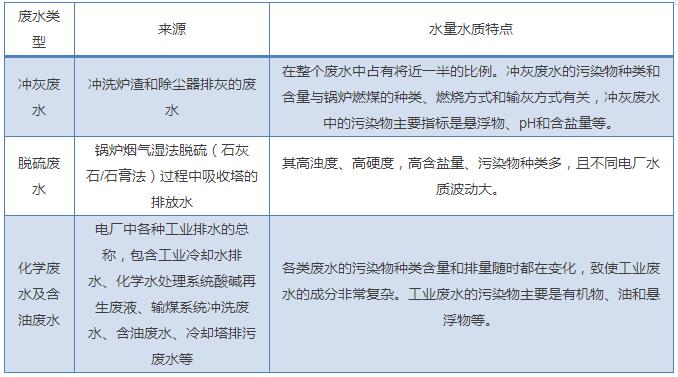 電廠廢水來(lái)源廣泛,主要分為以下幾類:沖灰廢水、脫硫廢水、工業(yè)廢水(化學(xué)廢水及含油廢水)。與化工、造紙等工業(yè)廢水相比,火電廠的廢水有以下特點(diǎn):水質(zhì)水量差異很大,劃分的廢水的種類較多;廢水中的污染成分以無(wú)機(jī)物為主,有機(jī)污染物主要是油;間斷性排水較多。電廠廢水來(lái)源及水質(zhì)特點(diǎn)總結(jié)于下表。