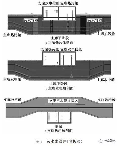 降板法出線,即在污水出線位置管廊底板下臥,除污水外,其余管線沿底板下臥,上部空間為污水單獨使用,并根據(jù)需要將頂板局部下降,以便于污水支管的預留以及檢查井的設置(見圖3)。