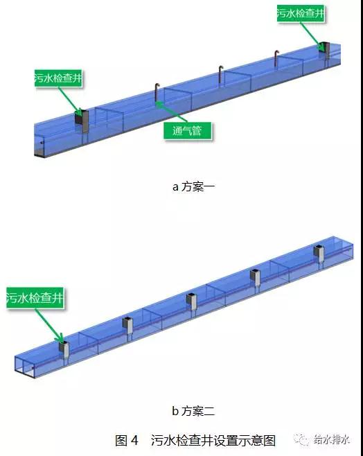 方案一是采用建筑室內(nèi)排水模式,即針對污水管道的通氣要求,每隔一定距離設通氣管保持與大氣聯(lián)通,每隔一定距離設置檢查口與清掃口以保障管道日常檢修與疏通,通過順水三通銜接支管與主管;方案二采用市政排水模式,每隔一定距離設置檢查井。以上兩種方式均存在一定不足。
